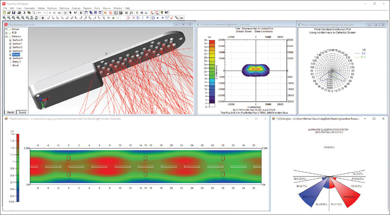 Notice in the figure that 18.2 percent of the light is trapped, 35.2 percent propagates in the forward direction onto the street, and 16.8 percent emits backward onto the sidewalk. We still need another analysis tool to see if light trespass is going to be a problem and determine the pattern on the walkways and roadways for problem areas. The trapped light in this design is mostly due to the free-form lens shape creating a lot of total internal reflection in the LED/lens assembly and could easily be redesigned to reduce this waste of energy by using differently shaped profiles of the peanut shaped lenses over the LEDs.