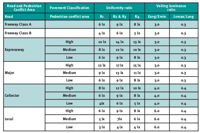 The current roadway lighting levels specification for the United States is the National Standard Practice for Roadway Lighting RP-8-00 by IESNA and CIE 140 in Europe. CIE changed their regulations from the older CIE 30.2 to the new revamped CIE 140 due to requests for an updated standard that decreased the spacing between poles for better visual clarity and better luminance criteria from the observed driver perspective.