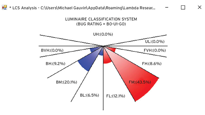 The first new software advance critical for a streetlamp design is the BUG luminaire classification figure. This figure is used to categorize a streetlamp to see if it passes the IES TM-15-11 standard. The BUG rating figure quickly gives designers the knowledge of how much light is going in the forward, backward, upward, and trapped direction in the fixture for their design.