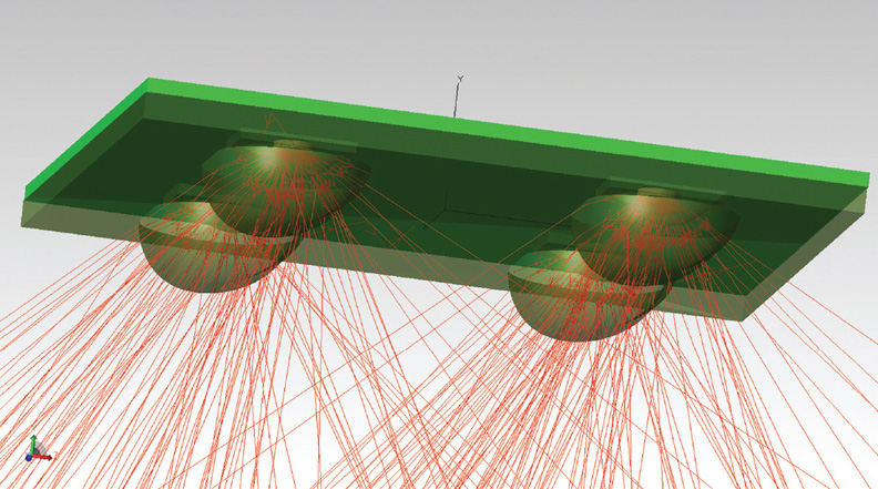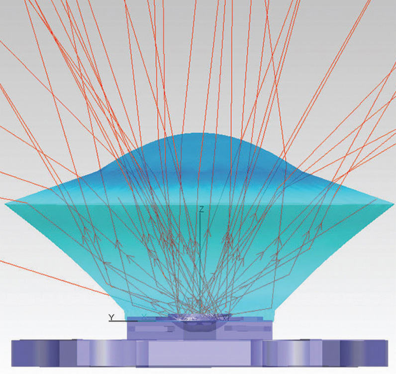 Ten years ago, the typical lens system used lenses placed on top of LED arrays to produce the angular output needed for the specified uniformity on the street or roadway. Usually TIR lenses with conventional optical features in the center of the lens are used to place light where needed. A typical individual streetlamp lens with rays traced is shown in Figure 2. The LED and lens arrays can be placed in either a planar or rotated array around an axis to send light into zones that overlap to create the best total uniformity on the roadway. Diffusers are also used in this scenario below the LED and lens arrays to create better uniformity and reduce the harsh, direct light from the LED/lens source.