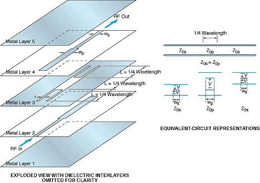 The basic configuration of the device is illustrated in Figure 1. All of the dielectric layers (not shown) between the metal layers are assumed to be of equal thickness h and equal relative permittivity εr. The quarter-wavelength slots in the input and output regions of layer 3 suppress undesired components of interlayer propagation in those regions. Specific dimensions can be altered somewhat (for example, slot lengths can be made to differ slightly from a quarter wavelength) to suit specific applications, without deviating from the overall design concept.