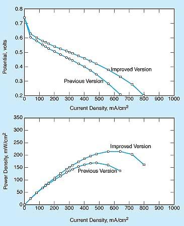 The performances of electrode structure made by a previous method and by the present improved method were evaluated in a laboratory fuel-cell apparatus at a temperature of 90 °C. In each case, a 1 molar aqueous methanol solution was circulated past the anode side, while air at 20 psig (gauge pressure of 14 kPa) was circulated past the anode. The measured performance of the improved version was superior; in particular, the peak power density of the improved version was 210 mW/cm², as compared to 160 mW/cm² for the previous version. Because of the greater power density, the weight of a fuel-cell stack could be reduced by about 25 percent without loss in performance.