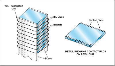 In addition to I/O drive currents supplied via I/O pads, operation of a VBL chip depends on two spatially uniform magnetic fields perpendicular to the chip plane: a dc magnetic bias field and field oscillating at a frequency of several megahertz for VBL propagation. In a device as proposed, the dc magnetic bias fields would be provided by permanent-magnet plates between the chips and at the ends of each stack. The high-frequency VBL-propagation magnetic field would be generated by use of a coil surrounding the stack.