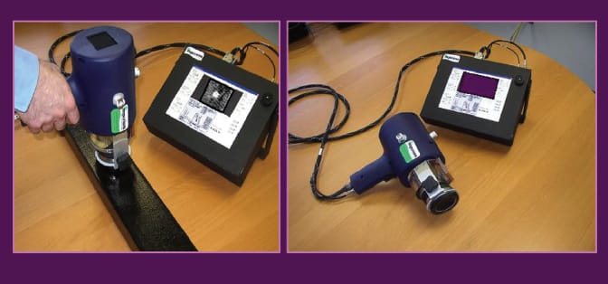 The instrument (see figure) would be placed on a selected area on an object of interest believed or suspected to contain a matrix symbol (hereafter denoted, simply, the target). Intimate contact for the purpose of coupling of low-energy ultrasound would be ensured by use of either a flexible membrane camera face or a replaceable gel pad. Ultrasound pulses would be transmitted from a transducer, through the membrane or gel pad, into the target. A portion of each ultrasonic pulse, as modified by any matrix symbol present in the target, would be reflected through the membrane or gel pad to an ultrasound-imaging integrated-circuit chip, which would convert the resulting spatial variation of ultrasound pressure to voltages that could be used to construct a video image of the matrix symbol (if any).