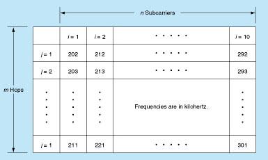 Figure 2. This Table Lists Subcarrier Frequencies for an example of an array of n = 10 subcarriers and m = 10 hops. Each cell (i,j) in the table gives the frequency of the ith subcarrier during the jth interval between frequency hops.