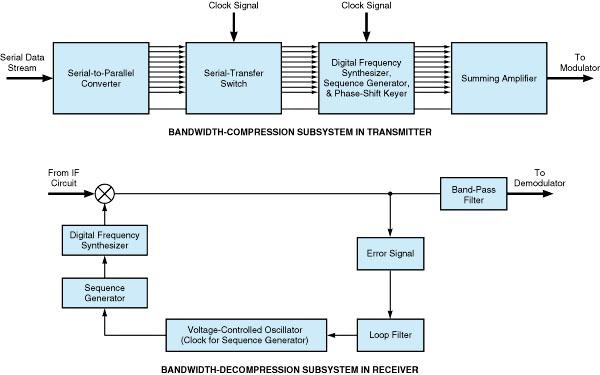 Figure 1 presents block diagrams of the bandwidth-compression and -decompression portions of an FH/PFDM transmitter and receiver, respectively. In the transmitter, the incoming data stream to be transmitted would first be converted from serial to parallel format and grouped into data blocks of n slots, each slot corresponding to one of n subcarrier frequencies generated by a digital frequency synthesizer. Next, a serial transfer switch would transfer the data bits into a buffer. Under sequential strobing by clock pulses, data bits would be strobed from the buffer into modulo-2 adders, the outputs of which would be modulated onto the subcarriers by phase-shift keying (PSK). The data bits would be interleaved in the sense that each successive data bit would be phase-modulated onto one of the subcarriers in a sequence of increasing subcarrier frequencies.