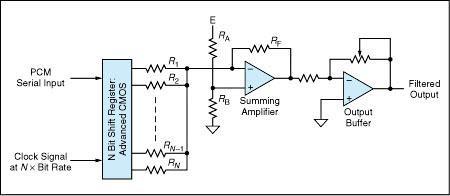 The DAP filter (Figure 2) comprises three main parts: (1) a part that divides each bit into a number of segments, (2) a part that converts each segment into a voltage that approximates the output of an ideal premodulation filter, and (3) an output buffer amplifier. An integer frequency multiple of the bit-rate clock signal is used to shift the serial digital output through a parallel output shift register to segment each bit. The conversion to a voltage level can be accomplished by a resistor array and summing amplifier to approximate the rise or fall of a half cosine wave for each bit transition. If the integer frequency multiple of the bit-rate clock signal is not available from the signal source, it can be generated from the source bit-rate clock signal by use of a phase-lock loop.