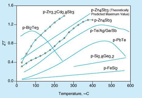 The thermoelectric figure of merit, ZT is given by ZT = α2T/ ρλ, where αis the Seebeck coefficient, T is the absolute temperature, ρ is the electrical resistivity, and λis the thermal conductivity. The figure illustrates ZT as a function of temperature, both from the theoretical prediction described above and as calculated from measurements on p-doped β-Zn4Sb3, on other state-of-the-art p-doped thermoelectric materials, and on a p-type Zn4Sb3/Cd4Sb3 solid solution of nominal composition Zn3.2Cd0.8Sb3. In the cited prior article, the high ZT of p-type β-Zn4Sb3 in the temperature range of interest was attributed partly to its low thermal conductivity, which was then the lowest known thermal conductivity of any thermoelectric material in that temperature range. Since then, the thermal conductivity of the Zn3.2Cd0.8Sb3 solid solution has been found to be even lower. The net result is that the ZT values of Zn3.2Cd0.8Sb3 exceed those of β-Zn4Sb3 at temperatures > 50 °C, reaching a high value of 1.4 at a temperature of 250 °C.