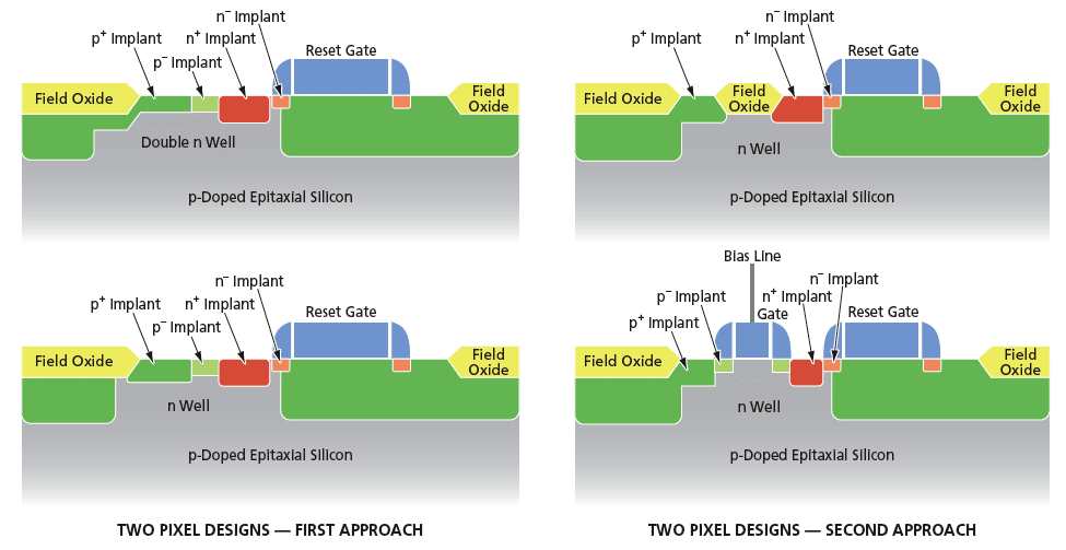 Beyond a certain electric strength, the leakage current depends very strongly on the strength of the electric field. In order to reduce electric fields in the reverse-biased junctions, the p wells are separated from the n wells. A double n well in each pixel is preferred, both for increased photocarrier-collection efficiency and for tailoring the doping so that the electric field in the transition region between p+-to-n-well region is low.
