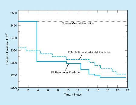 Figure 2 shows the dynamic pressure at which flutter occurred as the simulation progressed. The dashed line represents the unstable flight conditions for the F/A-18 simulation; this line shows changes, even at constant-mach-number flight, because of the temporal variation of mass. The dotted line represents the traditional prediction, which was inaccurate inasmuch as it was based on the nominal model with no accounting for errors. The solid line represents the flutterometer prediction, which was computed by use of sensor data starting at 3 minutes (simulated time) after the beginning of the simulation to identify errors in the nominal model. These errors account for the unmodeled temporal variation of mass, so that the predicted worst-case flight conditions associated with flutter remain conservative to the true unstable conditions. The flutterometer could be used to determine safe test points for envelope expansion because the unstable flight conditions are predicted by use of data throughout the flight to account for unmodeled temporally varying dynamics.