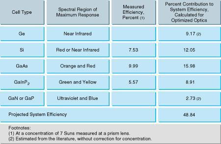 Preliminary experiments to demonstrate the feasibility of this concept were performed on several types of cells, using artificial sunlight and prisms that had not been optimized. On the basis of these experiments plus references to the literature, it has been estimated that an optimized system of this type could perform with an energy-conversion efficiency approaching 50 percent (see table). In contrast, the more-expensive multijunction solar cells yield efficiencies between 20 and 30 percent, while the efficiencies of conventional solar cells range from 11 to 19 percent in white light.