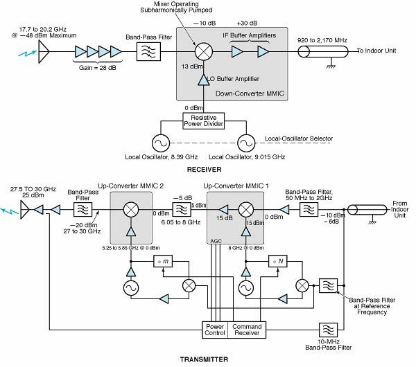Monolithic microwave integrated-circuit (MMIC) frequency converters have been developed for use in satellite- and ground-based communications (see figure) at frequencies from about 18 to about 30 GHz. These and similar converters can be expected to exert significant effects on the sizes, costs, and performances of terminals for the next generation of K- and Ka-band communication systems. The rapid increase in the number of such systems is expected to give rise to a demand for tens of millions of frequency converters during the next few years.