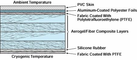 A typical insulating system for use on cryogenic equipment is an integrated, layered structure that includes a backing layer on the cold side and protective layers on the warm side (see figure). One of the protective layers is a tightly woven fabric coated with polytetrafluoroethylene (PTFE), which serves as a vapor barrier to prevent condensation of moisture. Multiple layers of polyester foil coated with aluminum serve as radiation shields and give additional protection from the environment. An outer layer of polyvinyl chloride (PVC) in the form of pipe or a foil jacket provides secondary protection from the environment and protection against mechanical impacts. This system can be designed as a fully flexible blanket type configuration or a pre-formed molded type configuration for installation on a variety of cryogenic storage and transfer equipment.