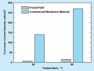 Figure 2 presents an example of experimental data that show that the methanol-crossover rate of a membrane/electrode assembly made with PSSA/PVDF was less than that of one made with an expensive commercial perfluorocarbon proton-exchange membrane that has been the membrane of choice for methanol fuel cells in recent years. Another advantage of a PSSA/PVDF membrane over the commercial membrane arises in connection with oxygen-flow rates. The necessary circulation of oxygen past the cathode undesirably tends to dry the membrane, thereby increasing its electrical resistivity. Therefore, to minimize the drying effect, it is preferable to operate a fuel cell at the smallest feasible oxygen flow. A fuel cell containing a PSSA/PVDF can function well at a small oxygen flow, whereas one containing a membrane of the commercial material performs poorly at a small oxygen flow.
