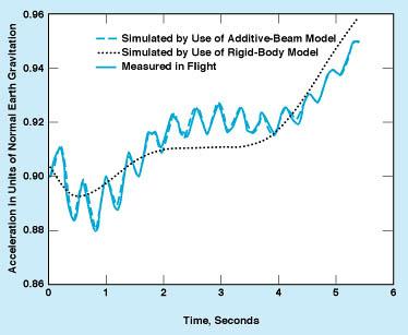 A model of the SR-71 is generated by analyzing flight data according to the parameter-estimation method and utilizing a general model that includes the additive beam. Figure 2 presents an example of flight data - acceleration measured near the pilot station during a pitch maneuver - along with the corresponding simulated responses of a rigid-body model and the model that includes the additive-beam submodel. Responses from the additive-beam model are very similar to the flight data and are clearly more accurate than are the responses from the rigid-body model. Thus, the additive beam has been shown to represent accurately the first bending mode of the fuselage.