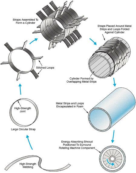 All the looped straps thus fabricated would be assembled side by side over the cylinder of metal strips. The sewn loops would be folded to lie circumferentially against the outer surface. Depending on the specific design, another subassembly comprising another two layers of metal strips and another layer of straps with sewn loops could be formed around the previous one. The entire assembly would then be encapsulated in a rigid, low-strength foam, thereby forming a unitary energy-absorbing cylinder that would be mounted around the rotating component that posed a disintegration hazard.