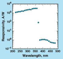 Figure 2 shows the measured responsivity of one detector element. This detector element was found to have a responsivity of 3.1 ± 0.3 A/W at a wavelength of 365 nm, a response time of 0.5 ± 0.2 ms, and a dark current of 5 ×10 - 11 A; as of the time of submission of the information for this article, these performance figures were the best yet reported for GaN ultraviolet detectors.