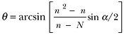 where n and N are the indices of refraction of the prism and the surrounding medium, respectively; ℓ is half the difference between the old and new distances along the optical path inside the prism; and L is half the difference between the new and old distances along the optical path outside the prism. By the law of sines,