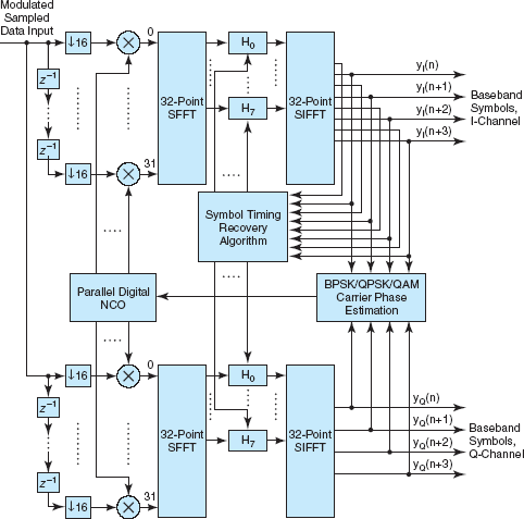 Upstream of this demodulator, the received analog signal is converted to an intermediate frequency (IF) suitable for analog-to-digital (A/D) conversion, band-pass filtered, then digitized at a rate of 4 samples per symbol. The band-pass filtering rejects some noise and prevents the aliasing that would otherwise occur after A/D conversion. The digital signal is split into 32 parallel paths, decimated by 16 on each path, and digitally mixed on each path with a replica of the sampled IF carrier signal. The discrete Fourier transform (DFT) of the resulting 32 data points is then taken, via a specialized fast Fourier transform (SFFT), and multiplied by the one element of a bank of frequency-domain-matched filters. The correct matched filter is chosen by the closed-loop symbol timing recovery algorithm (see figure).