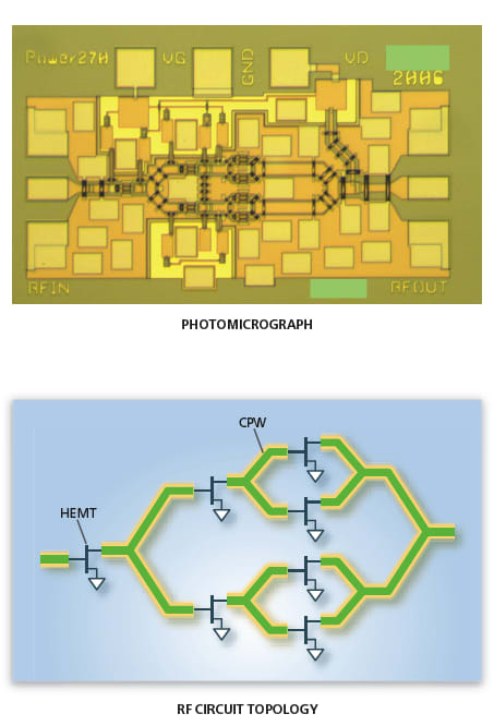 One of the amplifiers designed and tested at 330 GHz is shown in Figure 1. It is a three-stage unit containing one HEMT in the first stage, two HEMTs in the second stage, and four HEMTs in the third stage, with 1:2 CPW power splitters between the HEMT stages. The outputs of the third-stage HEMTs are coupled via a 4:1 CPW power combiner. Each HEMT is a two- finger device having an output periphery of 10 μm per finger, so that the total output periphery per HEMT is 20 μm. Hence, the total output periphery of all four third- stage HEMTs is 80 μm. Because the layout is so extremely compact that individual biasing of each stage cannot be accommodated, the gate and drain bias conductors of all seven transistors are tied together.