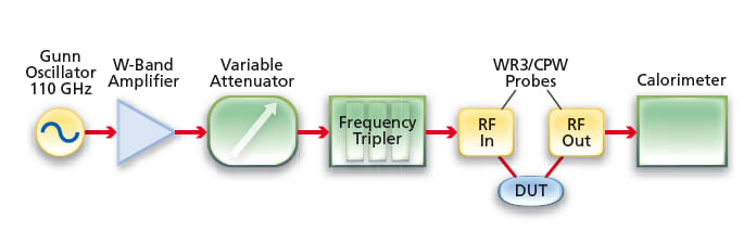 Figure 2 schematically depicts the power test set as configured for characterizing this amplifier or another device at 330 GHz at different input power levels. A Gunn oscillator generates a 110-GHz signal, which is then fed via a W-band amplifier and a variable attenuator to a frequency tripler. The output of the frequency tripler is a 330- GHz power source used as the input signal for the amplifier or other device under test (DUT). A calorimeter measures the power output of the DUT. Input and output coupling of the 330-GHz signals between the test set and the DUT is effected by means of commercially available waveguide probes of WR3 cross section (a standard rectangular cross section for a nominal frequency range of 220 to 325 GHz) with transitions to CPW contacts at one end. For measurement of the DUT-input 330-GHz power, the output of the frequency tripler is coupled directly via a waveguide to the calorimeter. For measurement of power levels used to correct for losses in the probes, a standard section of CPW is substituted for the DUT. In tests performed thus far, the amplifier exhibited an output power of 1.6 dB, with a maximum low power level gain of 7 dB.