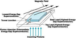 Usually, an STJ photodetector contains three superconductors with different superconducting energy gaps. Photons in the energy range of interest are absorbed in the superconductor with the intermediate energy gap; this superconductor and the one with the lowest energy gap are separated by a layer of electrical insulation thin enough that photo-excited quasi-particles can tunnel (in the quantum-mechanical sense) through it. Together, the intermediate- and lowest-energy-gap superconductors and the insulating layer between them constitute the detector junction. The superconductor with the highest energy gap is used for wiring to the other two superconductors. In a typical previously developed STJ array, separate electrical connections are made to each photodetector (see Figure 1).