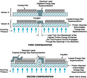 - In a typical previously developed STJ array of m rows and n columns, the number of electrical contacts necessary for individual biasing and readout of all pixels is 2mn because two contacts are needed for each pixel. In an STJ according to the present method, the number of contacts needed would be mn + 1 (slightly more than half the number previously needed) because the photon-absorbing (intermediate-energy-gap) superconductors of all the pixels would be electrically tied together by the largest-energy-gap superconductor.