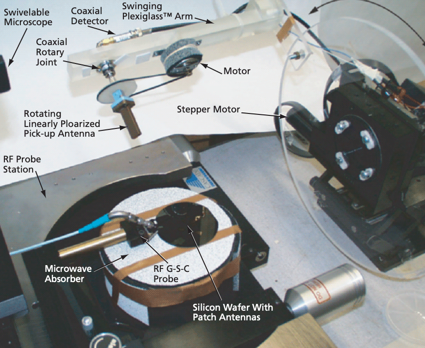 The apparatus includes (1) a commercial coplanar-waveguide ground-signal-ground radio-frequency (RF) probe, through which microwave excitation is applied to a microstrip transmission line that is part of the integrated circuitry of the patch antenna under test; (2) DC probes for biasing the microelectromechanical actuator; (3) a spinning linearly polarized antenna for sampling the linearly and circularly polarized radiation from the patch antenna as a function of angle relative to the perpendicular to the plane of the wafer; and (4) an automatic network analyzer/microwave receiver for measuring the sampled signal. The microwave probe is a commercial unit of the coplanar-waveguide (CPW) ground-ground-signal-ground type. The microwave and DC probes (see Figure 1) are installed in a commercial RF wafer probe station that has been modified to accommodate the rotating sampling antenna.
