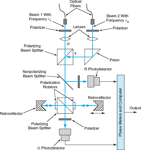 The figure schematically depicts a typical heterodyne interferometer. The interferometer utilizes two laser beams with frequencies ν1 and ν2 that differ by a known small amount (typically, | ν1 – ν2| is of the order of 1 to 100 kHz). Beams 1 and 2 are p- and s-polarized, respectively, in the reference frame of two polarizing beam splitters. Polarizers, polarization rotators, and a nonpolarizing beam splitter are used, along with the polarizing beam splitters, to separate and combine the beams at several junctions along the light path. The beams are made to interfere with each other at two photodetectors called the “reference” (R) and the “unknown” (U) photodetector, respectively. Ideally, all of the s-polarized light that arrives at the lower beam splitter makes one and only one round trip along the lower horizontal interferometer arm between two corner-cube retroreflectors, and then impinges on the U photodiode.