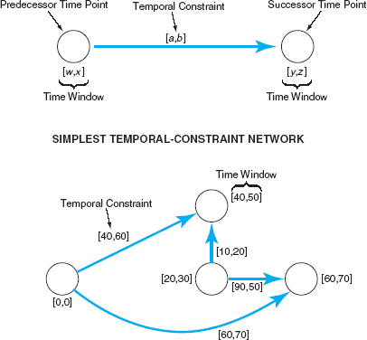 A forward sweep starts from a set of time points that have no predecessors. These time points are put in the propagation queue, then the sweep proceeds until the queue is empty. The backward sweep starts from a set of time points that have no successors, and then proceeds similarly to the forward sweep. It is assumed that there are no cycles (time-constraint paths that begin and end at the same time point) so that the algorithm will not enter an infinite loop during a sweep. The algorithm performs as many iterations as are needed until either (1) there is no window left to be updated or (2) a window of negative length is created. In case (1), the final windows of all time points are considered to have been computed and the network is considered temporally consistent. In case (2), the algorithm returns the message to the effect that the network is temporally inconsistent.