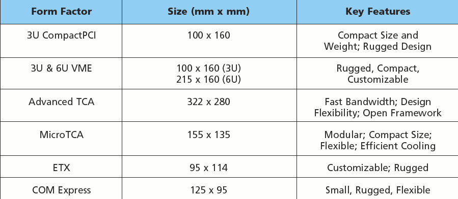 Many popular embedded computing platforms are taking advantage of these innovations to provide the critical building blocks for embedded industrial and rugged systems. The following provides an overview of some of the latest off-the-shelf embedded solutions now available in industry-standard form factors (see Table 1).