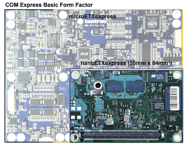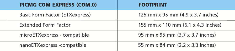 COM Express includes specifications for small-form-factor modules to satisfy the high-performance segments of the embedded industry. The COM Express standard currently includes “basic” and “extended” form factors following one of the five PICMG-defined pin-outs. In addition to offering “basic” modules with the ETXexpress product family, two compatible smaller form factor modules — microETXexpress and most recently nanoETXexpress (as illustrated in Table 2) — have been developed. The nanoETXexpress modules have a footprint just 39 percent of the original COM Express standard “Basic” form factor module.