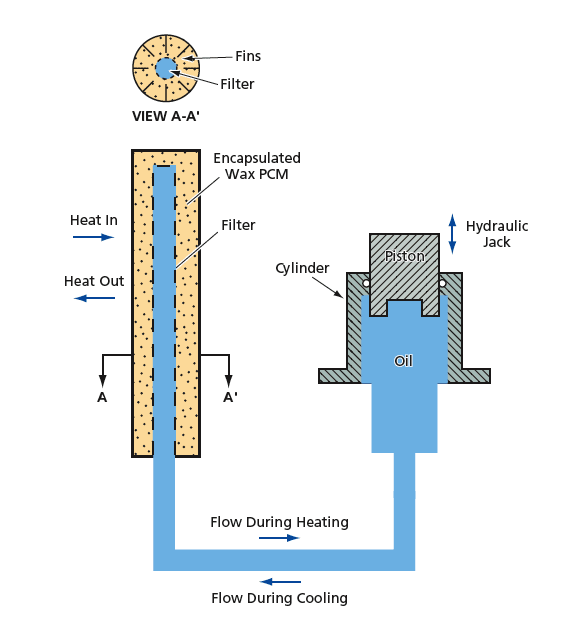 The figure illustrates a simple example of a hydraulic jack driven by a thermally actuated hydraulic pump. The pump chamber would be a cylinder containing encapsulated wax pellets and containing radial fins to facilitate transfer of heat to and from the wax.