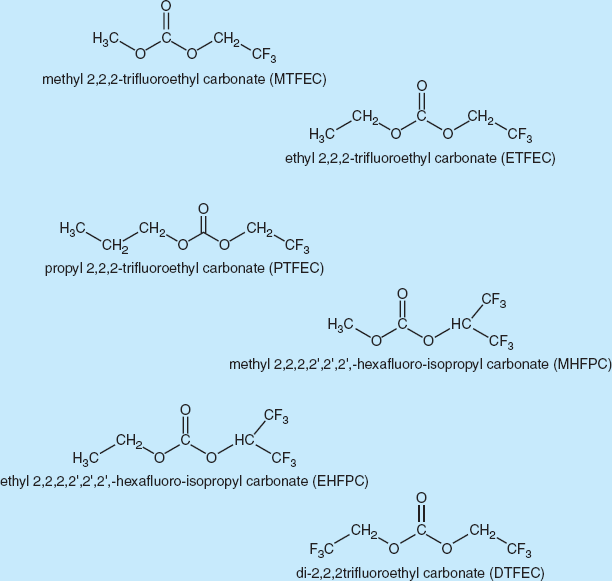 The partially fluorinated carbonate solvents studied (see figure) include: