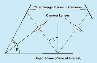 In PIV and similar systems described in previous articles in NASA Tech Briefs, cameras are aimed perpendicularly to the planes of interest to obtain images indicative of two-dimensional velocities in those planes. Because of the stereoscopy, the images obtained in the present system also contain information on the component of velocity perpendicular to the plane of interest. Of the possible stereoscopic arrangements, the one used in this system involves aiming the lenses of both cameras toward a common point on the plane of interest and tilting the image planes in the cameras to satisfy a condition called the "Scheimpflug condition" (see figure). The advantage of the Scheimpflug condition is that all points of the plane of interest are brought into focus on the image planes, with consequent reduction of the requirement for depth of focus. The Scheimpflug condition entails a minor disadvantage in that it introduces some distortion; for example, a suitably oriented rectangle in the object plane becomes imaged to an isosceles trapezoid. Fortunately, a correction for this distortion can be readily incorporated into the image-data-processing algorithm.