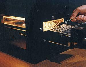 The mechanics of the NREL optical processing furnace are similar to those of a rapid thermal processing furnace. A bank of halogen lamps delivers heat and the targeted visible and near-infrared light that generates the photonic effect. A quartz muffle forms the inner chamber of the furnace, argon gas keeps out oxygen and contaminants (unless a reactive gas is part of the treatment), and a computer controls gas flow and intensity and duration of the light — typically 60 to 90 seconds. Control of light wavelength spectrum, intensity, and duration helps target particular portions of the treated device and produce the desired interaction.