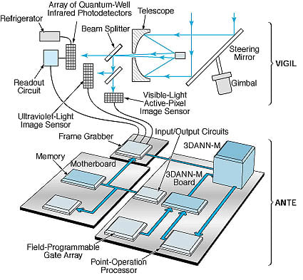 VIGILANTE comprises two main subsystems (see figure). The VIGIL subsystem is an airborne telescope used to acquire image data for target-recognition experiments and to test novel passive and active focal-plane image sensors. The telescope will ultimately include a 15-cm Cassegrain unit, a gimballed mirror, and optical and electronic channels for multiband (infrared, visible, and ultraviolet) image sensors.