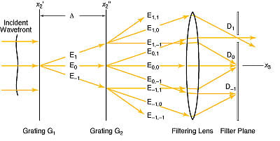 Suppose that the grating lines are oriented along the x1axis. Figure 2 illustrates the formation of the first few diffraction orders by each Ronchi grating, and the formation of some of the resulting images on the filter plane. The reflected wavefront incident on Ronchi grating G1is diffracted into wavefronts E1, E0, and E -1, among others, these orders corresponding to diffraction orders 1,0, and -1, respectively. (For the sake of simplicity, only these orders are shown, though many others could be present.) Each of these wavefronts is diffracted by Ronchi grating G2, yielding wavefronts E1,1 through E -1, -1, among others. Various sets of parallel diffracted beams are combined by the filtering lens to form diffraction spots D1, D0, and D-1, among others.