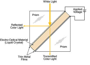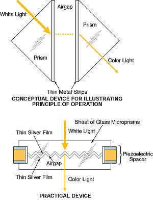 For example, theoretical calculations were performed for a device like that of Figure 1 comprising TiO2 prisms with 45° angles, silver films 35 nm thick, and a 150-nm-thick electro-optical film made of a recently developed liquid crystal, the index of refraction of which can be made to shift as much as 0.5. According to the calculations, with no voltage applied to the silver films, the device would exhibit peak transmission at a wavelength of 450 nm (blue), with an efficiency of 62 percent. With enough voltage applied to shift the index of refraction by 0.5, the peak of the transmission spectrum would be shifted to 650 nm (red), and the efficiency would be 70 percent.