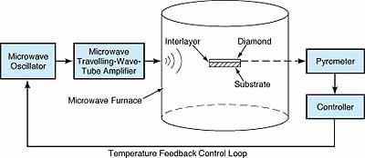The proposed microwave brazing technique allows for selective heating of the interlayer composition, which can be a thin braze filler metal or a combustion synthesis compound. This method utilizes a microwave processing chamber where a diamond disk is placed on a braze interlayer atop a tungsten carbide substrate. The process involves monitoring the diamond's temperature with a pyrometer to control the microwave power, ensuring optimal brazing temperatures are achieved without damaging the diamond.
