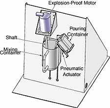 During this process, the operation of the automated blending machine is controlled by a program executed on a personal computer. The program activates the explosion-proof motor, which rotates the shaft/impeller assembly. The program also activates a pneumatic actuator that tilts the pouring container to pour the active propellant materials into the acetone/hexane/fluoroelastomer solution in the mixing container.