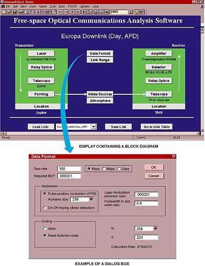 When FOCAS is opened in Excel, the program displays a block diagram of an optical communication link, including a transmitter, a free-space optical communication medium or channel containing noise sources, and a receiver (see figure). Each block in the diagram appears as a button that can be pressed to bring up a dialog box, through which the user can view and edit the parameters of the transmitting or receiving component, transmitting or receiving subsystem, channel, or link characteristic represented by the block. Other buttons below the block diagram enable the user to load or save parameters or view a link table, which is described below.