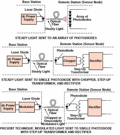 The figure illustrates two alternative techniques as well as the present technique for fiber-optic transmission of power from a base station to a remote station (sensor node) and conversion of optical to electrical power at the remote station. In the first technique, steady light is sent to an array of photodiodes, which are connected in series to build up the voltage to the required level. The disadvantage of this technique is that an array of photodiodes can be expensive, and there can be significant losses in the coupling of light from the optical fiber to the array, depending on the shape of the array.