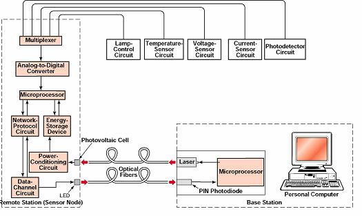 In the present system, power for the remote station (sensor node) is supplied by a small laser of the type used in compact-disc players. The laser light is transmitted via an optical fiber to the remote station, where a photovoltaic cell converts the light to electric power. By modulating the laser light, the base station can transmit commands to the remote station; this amounts to an optical analogue of the established power-line-carrier technique, in which an electric power line is used to carry small ancillary control or data signals superimposed on the main power signal.