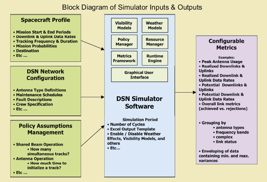 Additionally, the mixed-asset network modeling feature enables the simulation of scenarios with a user-defined mixture of antennas of different diameters, enhancing the flexibility and accuracy of the model. This allows for validation against the current DSN and mission set, providing a more realistic assessment of performance.