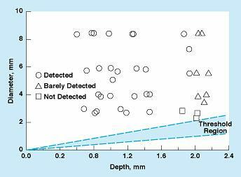 In the experiments, limits of detectability based on the depths and diameters of the holes were determined for each specimen material. For a SiC/SiC CMC, it was found that defects with depths <1.8 mm and diameters >2.6 mm will probably be detected (see Figure 1) by the technique used in these experiments. Similarly, it was found that for a composite of SiC fibers in a calcia/alumina/silica matrix (SiC/CAS) defects with depths <1.8 mm and diameters >1.6 mm will probably be detected; for a MMC of SiC/Ti, defects with depths <1.6 mm and diameters >3.2 mm will probably be detected; and for a PMC of graphite/polyimide, defects with depths <1.8 mm and diameters of about 3 to 12 mm will probably be detected. Depth appears to be the limiting variable with regard to detectability in the PMC.