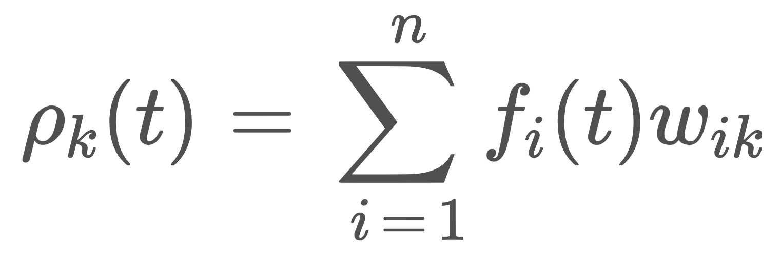 where pk(t) is a measure of the time-dependent index that the kth gearbox component is faulty, fi(t) is a value representative of the time-dependent flagged vibration-signal features from the ith accelerometer, and wik is a connection weight. As they would in a neural network, the connection weights embody the ranges of flagged feature values associated with various specific faults.