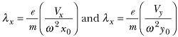 are scaling parameters, which describe the amplitude of ion motion between the plates. This amplitude is seen to be linearly proportional to the charge-to-mass (e/m), electric fields (Vx/x0, Vy/y0), and inversely proportional to ω². To see how the output pattern at the detector plane z = z0 looks, one would first define the incident particle velocity, then "tune" the rf angular frequency so that ωT= 2π for that velocity. In this case, one can obtain the simple expression
