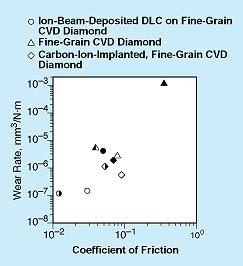CVD diamond offers some solid lubrication and resistance to wear. However, friction and wear rates of as-deposited CVD diamond depend on the environment; in particular, they are greater in vacuum than in humid air or dry nitrogen. CVD diamond can be modified by carbon- or nitrogen-ion implantation to obtain an amorphous, nondiamond carbon surface layer that reduces friction and wear regardless of the environment. However, the surface layer is usually ≤.5 μm thick; consequently, endurance is limited in the sense that use must typically be limited to light-load and/or short-term operations. In contrast, DLC films can be deposited to thicknesses as great as 5 μ m, with concomitant potential for increasing endurance.