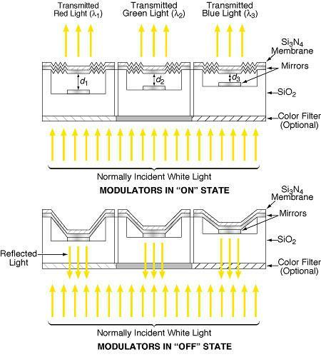 When voltage was not applied to the electrostatic-deflection electrodes, the springy silicon nitride membrane in each interferometer would maintain the nominal gap and therefore light of the nominal wavelength would pass through to the front (top in the figure) side, where it would be seen. When voltage was applied to the electrostatic-deflection electrodes of a given color interferometer in a given pixel, the spring force would be overcome and the two mirrors drawn together; this would eliminate the resonant gap, causing the two mirrors to act as ordinary mirrors so that light would not pass through to the front. The net effect would be that each interferometer would act as a light valve or modulator for its assigned color. Thus, by opening each light valve for a specified fraction of each image-repetition cycle, one could mix specified proportions of each color. Since the viewer's eye could not spatially resolve the individual interferometers or temporally resolve the individual flashes of light, the viewer would get the impression of a desired composite color emanating from the pixel.